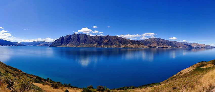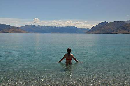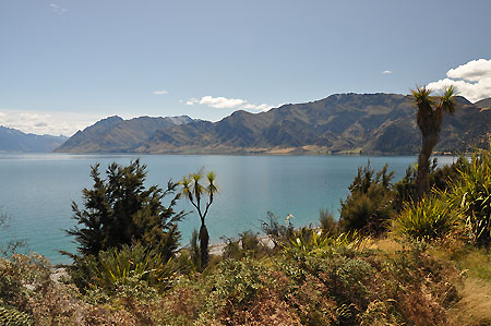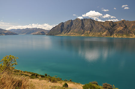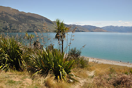 Am benachbarten, bis zu 392 m tiefen Lake Hawea geht es noch etwas ruhiger zu als in Wanaka, |