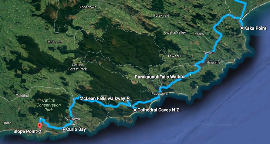 Also fuhren wir weiter durch die Catlins und legten den nächsten Stopp am Slope Point ein, dem südlichsten Punkt der Südinsel. Der Fussweg dorthin führt über Privatgelände, in diesem Fall eine Weide. Der Durchgang ist erlaubt, man wird lediglich angehalten, das Gatter wieder zu schliessen. Hier weht der antarktische Wind, was deutlich an den windgepeitschten Bäumen zu erkennen ist.