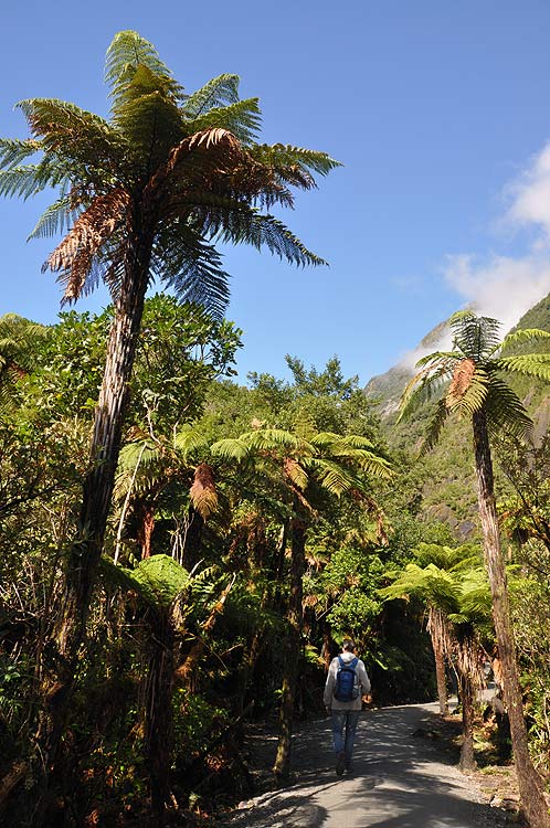 Etwa 25 km nördlich vom Fox Glacier Village befindet sich der Franz-Josef Glacier. Auch hier sind Helikopter das Allheilmittel gegen starken Gletscherrückzug, es brummt also nur so den ganzen Tag über am Himmel derweil am Boden Parkplatz und Wanderweg sehr stark frequentiert sind. Dennoch ist der Weg an sich sehr schön, führt er doch auch noch an Wasserfällen vorbei und man sieht immerhin etwas mehr bläulich-weisses Gletschereis als am Fox. Unser Gletscherfazit: Franz-Josef Glacier zu sehen hätte genügt, am Besten wäre es zweifellos per Hubschrauberflug gewesen, das hätte uns auch einiges an Zeit gespart. |